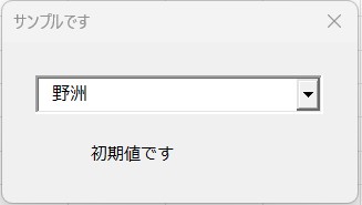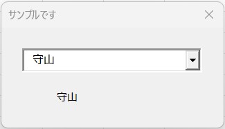 '*************** 実行 *************** Private Sub cmbSample_Change() 'コンボボックスで選択した値をラベルに反映 Me.lbSample.Caption = Me.cmbSample.Value End Sub |