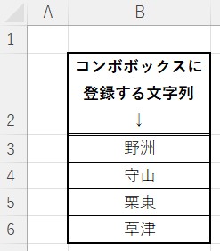 Sheet1にコンボボックスに登録したい文字列を入力しておくことにします。