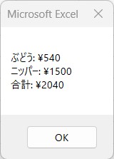 さらに値段を入力させ、それぞれの価格と合計金額もメッセージボックスで出力することにしてみます。(値段入力部分の実装の説明は冗長なので省略)