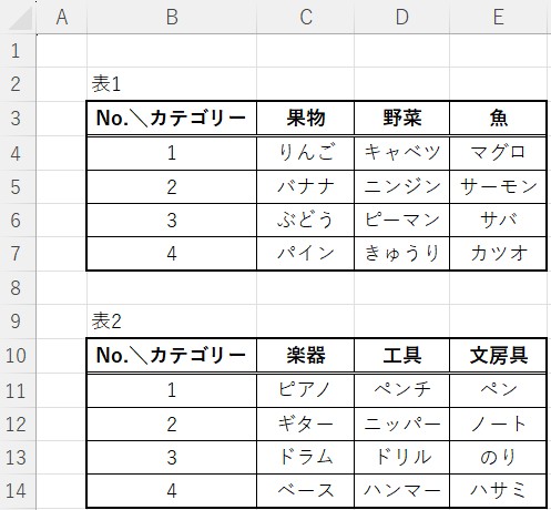 例えば、1回目のフォームで表1を扱い、野菜カテゴリーを選び、項目としてピーマンを選んで決定し、2回目のフォームで表2を扱い、文房具カテゴリーを選び、項目としてノートを選んで決定すると、結果として「ピーマン and ノート」のようにメッセージボックスを表示するという流れです。